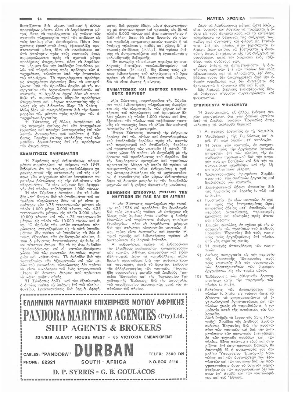 ΤΟ ΚΑΙΡΙΩΤΕΡΟΝ ΠΡΟΒΛΗΜΑ (Σελίδα 1)ΤΟ ΔΕΚΑΠΕΝΘΗΜΕΡΟΝ (Σελίδα 2)Ο ΝΕΟΣ ΠΟΙΝΙΚΟΣ ΚΑΙ ΠΕΙΘΑΡΧΙΚΟΣ ΚΩΔΙΞ Ε.Ν. (Σελίδα 11)ΔΙΑΚΕΚΡΙΜΕΝΗ Η ΜΕΤΑΧΕΙΡΙΣΙΣ ΤΟΥ ΝΑΥΤΙΚΟΥ (Σελίδα 13)ΔΙΑ ΤΗΝ ΕΠΙ ΠΛΟΙΩΝ ΚΑΤΑΡΤΙΣΙΝ ΠΛΗΡΩΜΑΤΩΝ (Σελίδα 15)ΕΝΑΣ ΝΕΟΣ ΕΛΛΗΝΙΚΟΣ ΓΙΓΑΣ ΕΓΕΝΝΗΘΗ (Σελίδα 18)ΕΞΕΛΙΞΕΙΣ ΕΙΣ ΤΟΝ ΝΑΥΤΑΣΦΑΛΙΣΤΙΚΟΝ ΧΩΡΟΝ (Σελίδα 21)ΤΟ ΑΚΤΟΠΛΟΙΚΟΝ ΘΕΜΑ ΚΑΙ ΑΙ ΜΙΚΡΑΙ ΤΟΠΙΚΑΙ ΓΡΑΜΜΑΙ (Σελίδα 25)Η ΑΛΛΗΛΟΓΡΑΦΙΑ ΜΑΣ (Σελίδα 29)ΕΝΑΣ ΠΡΩΙΝΟΣ ΔΙΑΛΟΓΟΣ (Σελίδα 31)Η ΧΘΕΣ ΚΑΙ Η ΣΗΜΕΡΟΝ (Σελίδα 33)Ο ΛΙΜΗΝ ΤΟΥ ΠΕΙΡΑΙΩΣ (Σελίδα 35)ΝΟΜΙΚΑ ΘΕΜΑΤΑ (Σελίδα 36)Η ΝΑΥΤΙΚΗ ΕΡΓΑΣΙΑ (Σελίδα 38)ΤΕΧΝΙΚΑ ΘΕΜΑΤΑ (Σελίδα 41)Η ΑΛΙΕΙΑ (Σελίδα 43)ΠΑΓΚΟΣΜΙΟΝ ΡΕΠΟΡΤΑΖ (Σελίδα 46)ΤΟ ΡΩΣΙΚΟΝ ΠΛΟΙΟΝ ΑΥΛΑΚΩΝΕΙ ΤΗΝ ΥΦΗΛΙΟΝ (Σελίδα 48)ΝΑΥΤΙΛΙΑΚΑΙ ΕΙΔΗΣΕΙΣ (Σελίδα 51)ΝΟΜΟΘΕΤΙΚΑΙ ΡΥΘΜΙΣΕΙΣ ΘΕΜΑΤΩΝ ΤΗΣ ΝΑΥΤΙΛΙΑΣ (Σελίδα 53)ΘΑΛΑΣΣΙΑ ΑΤΥΧΗΜΑΤΑ (Σελίδα 56)ΕΠΙ ΤΗΣ ΣΥΓΚΡΟΥΣΕΩΣ "ΠΑΣΙΦΙΚ ΓΚΛΟΡΥ" ΚΑΙ "ΑΛΛΕΓΚΡΟ" (Σελίδα 57)Η ΝΑΥΛΑΓΟΡΑ (Σελίδα 58)A FORTNIGHTLY ENGLISH SUPPLEMENT (Σελίδα 83)